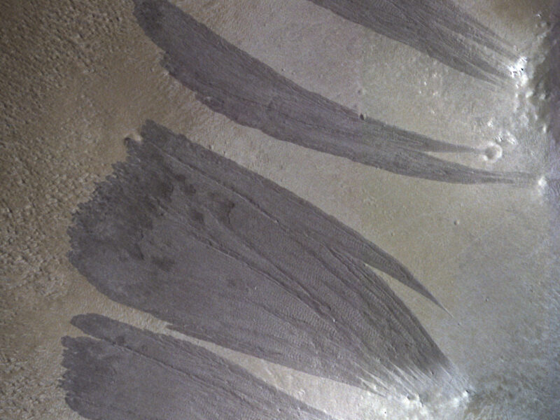 火星の急峻な斜面では、この画像のような暗い筋がよく見られます。「スロープ・ストリーク」と呼ばれるこの暗い筋は、何か暗い物質が滑り落ちたかのように見えるかもしれません。しかし実際にはそうではなく、火星の表面を多く塵がなだれのように斜面を滑り落ちたことで、塵の下にある表面が見えているものです。