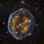 この画像に映っているのは、地球から約1万光年離れたところにある「AFGL 4106」という天体です。画像は、ヨーロッパ南天天文台(ESO)の超大型望遠鏡(VLT)に設置された観測装置「SPHERE」で撮影されました。オレンジ色に広がる複雑な雲の中心に、寄り添うように2つの「黒い点」が見えます。それらは、この天体の主役である2つの巨大な星の位置を示しています。