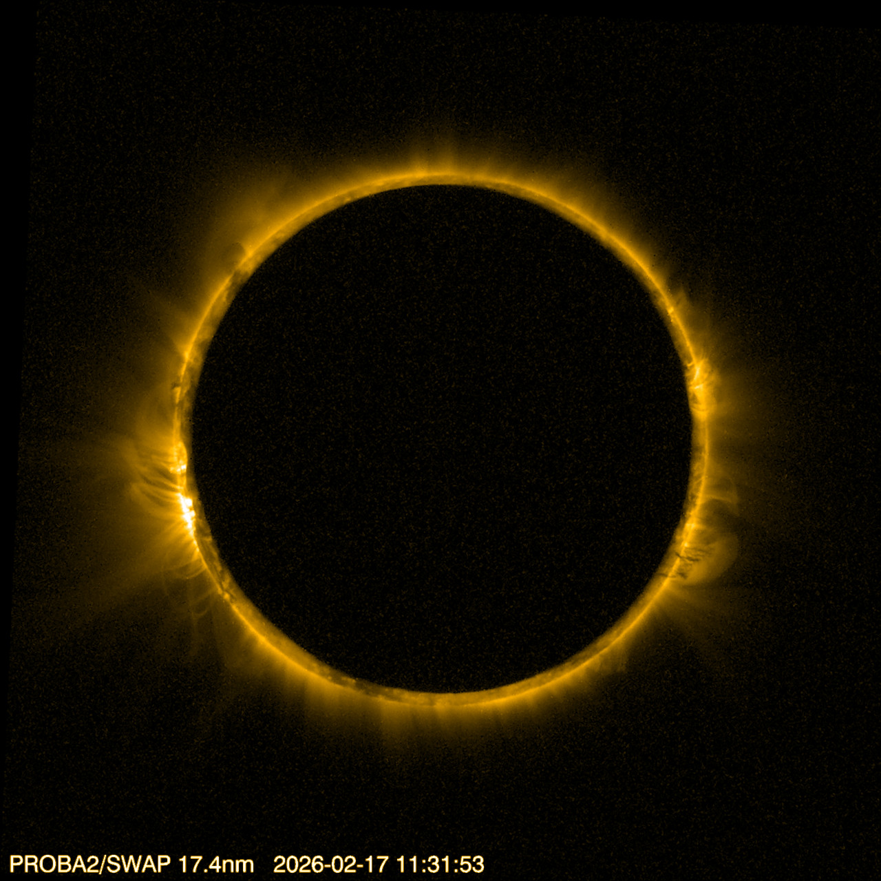 2026年2月17日の新月の日、地球上では南極から金環日食が見られました。ただこの画像は南極から撮影したものではなく、同じ日に宇宙から見た金環日食です。ESA(ヨーロッパ宇宙機関)のProba-2衛星が撮影しました。