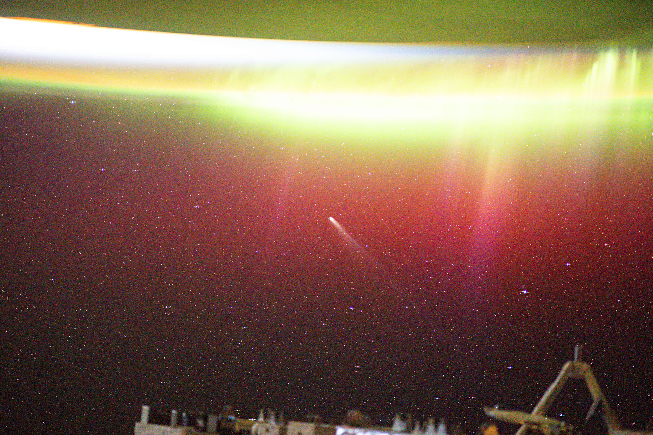 この画像は北米上空を通過中のISS(国際宇宙ステーション)から撮影されたもので、オーロラとともに尾をなびかせた彗星が映っています。