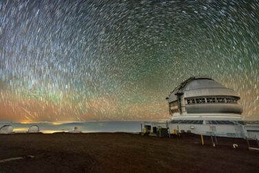 この画像はハワイ島、マウナケア山頂付近で撮影されたもので、画像右側にジェミニ北望遠鏡のドームが映っています。空には北の空の星々の軌跡が弧を描くように見えています...
