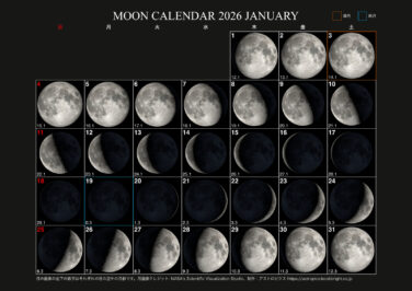 アストロピクスでは先日、2026年の1年間の月の満ち欠け(月齢)のカレンダーを掲載しました。今回紹介するのは、編集部で作成した2026年1月の月の満ち欠けカレン...