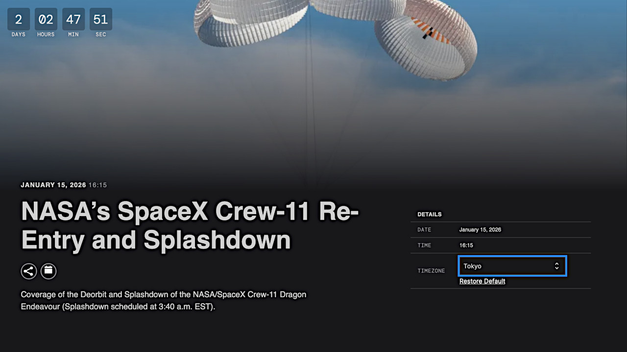 こちらは大気圏再突入と着水のライブ配信です。16時15分スタート予定。