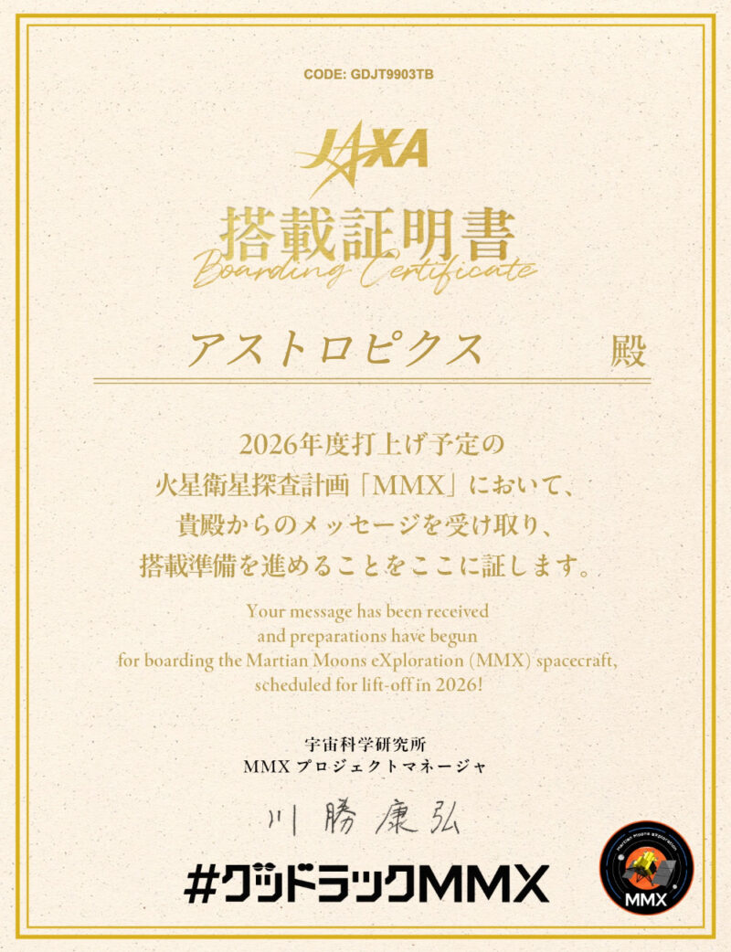 キャンペーンのウェブページから送った応援メッセージは、MMXに搭載されて火星圏へ往還します。メッセージを送付した際には、この画像のような「名前入り搭載証明書画像」をもらうことができます。メッセージの送付は、ウェブページのフォームにニックネーム(12文字以内)とメッセージ(200文字以内)を記入して送信するだけです。募集期間は2025年11月10日〜2026年1月18日23時59分まで。みなさんも応募してみてはいかがでしょうか。