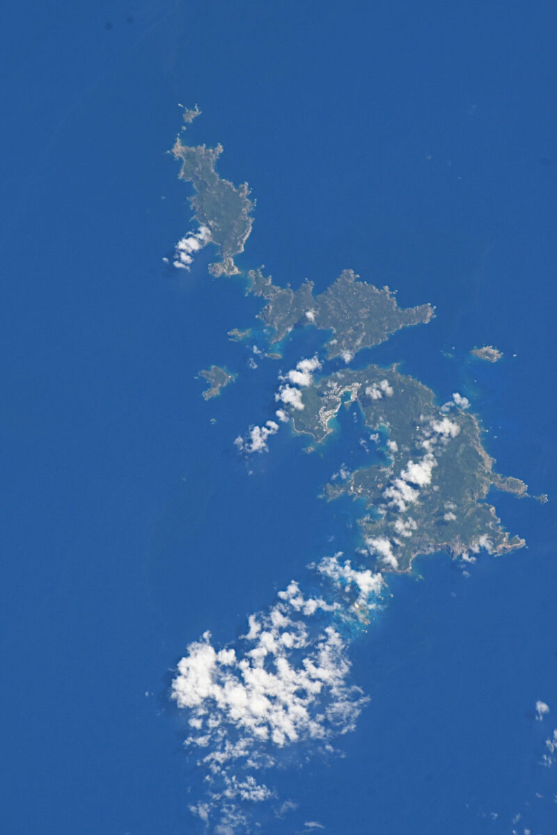 この画像はISS(国際宇宙ステーション)から撮影されたもので、東京都の小笠原諸島の父島列島が映っています。2025年8月24日9時59分ごろ(日本時間)に撮影されました。