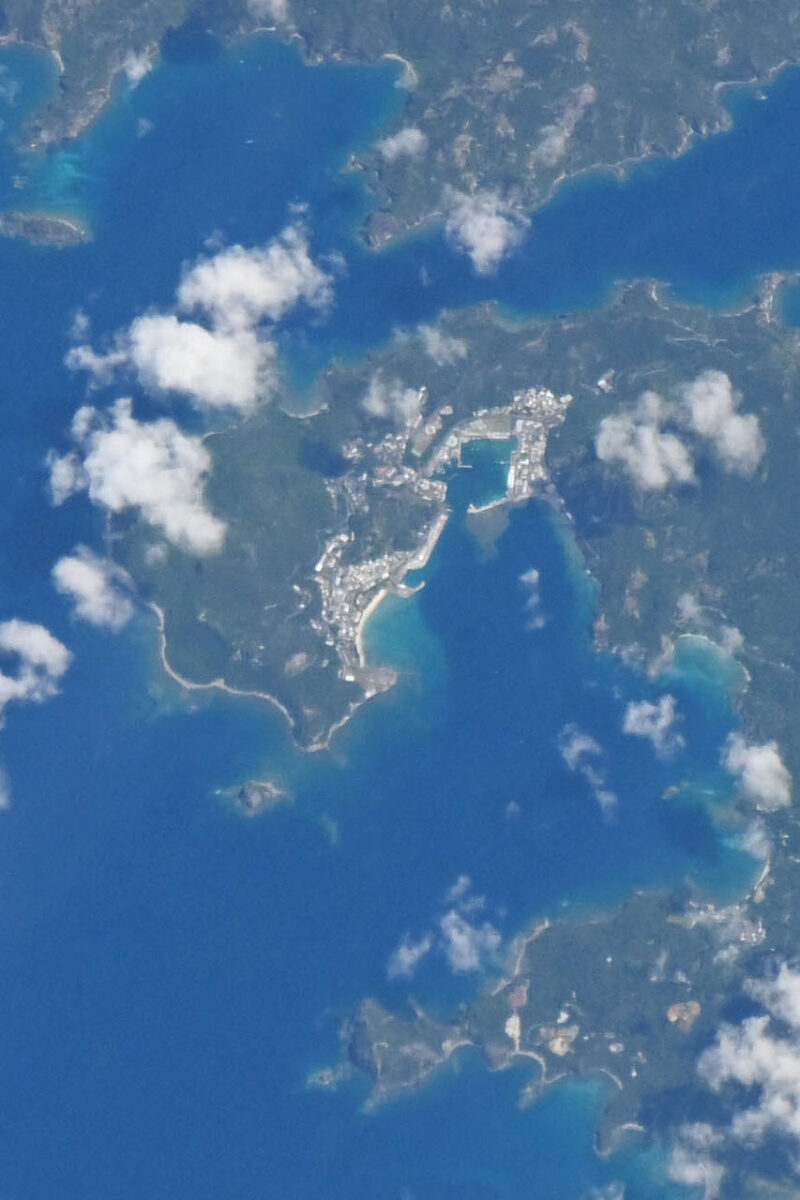 小笠原諸島は、東京から約1000km南の太平洋上にあります。画像には父島や兄島、弟島などが映っています。一番下に見える大きめの島が父島で、画像中央付近に二見港や周辺の集落がみえています。