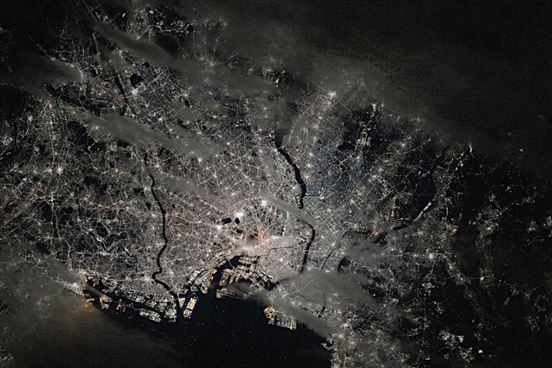 この画像はISS(国際宇宙ステーション)からとらえられたもので、東京周辺の夜景が映っています。2025年10月18日午前4時ごろ(日本時間)に撮影されました。9月に撮影された東京の夜景の画像と比べると、一部に雲がかかりぼやけているものの、道路などがくっきりと明るく見えています。