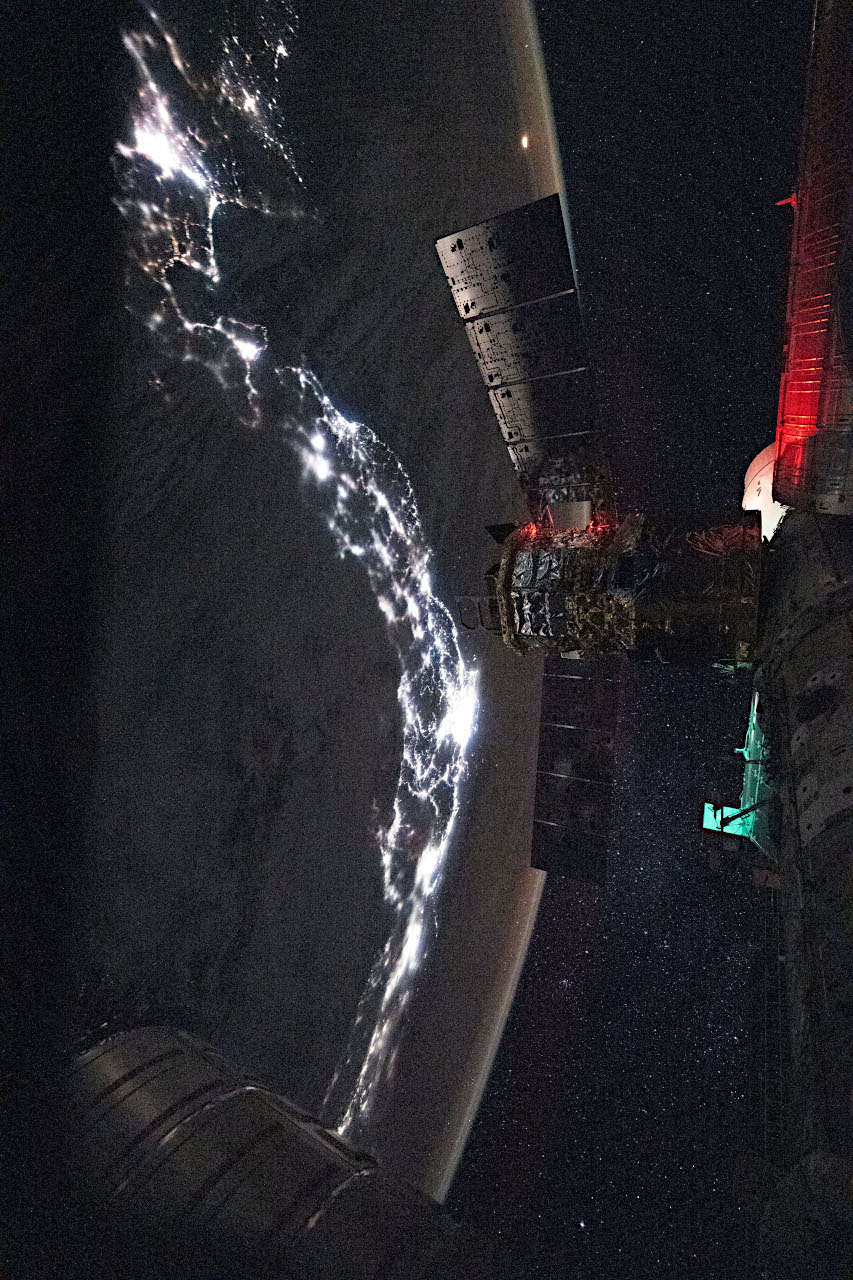 この画像はISS(国際宇宙ステーション)から撮影されたもので、画像左に日本列島の夜景、右側には2月7日にISSを離脱した日本の新型宇宙ステーション補給機(HTV-X)1号機が見えています。画像は2026年1月13日0時37分ごろ(日本時間、以下同)に撮影されました。