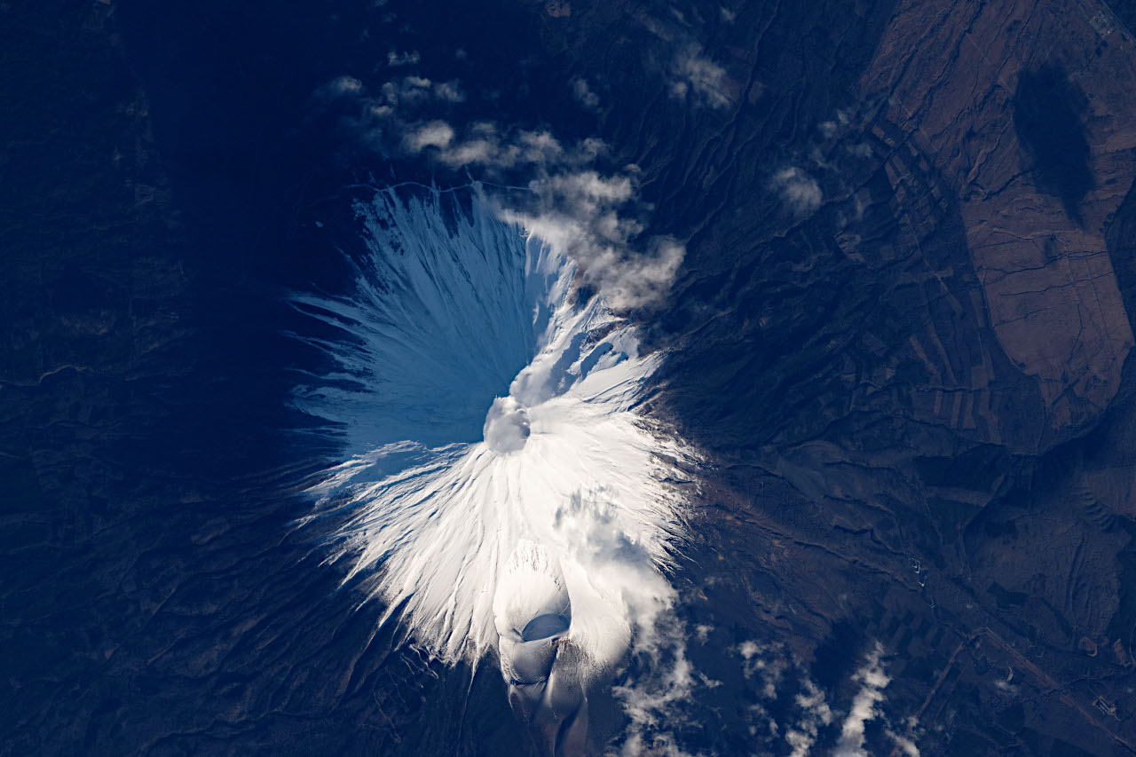 この画像はISS(国際宇宙ステーション)から撮影されたもので、富士山が映っています。2025年12月26日8時29分ごろ(日本時間、以下同じ)に撮影されました。一部に雲がかかっていますが、雪におおわれた山頂付近はよく見えています。画像下側に宝永火口があります。