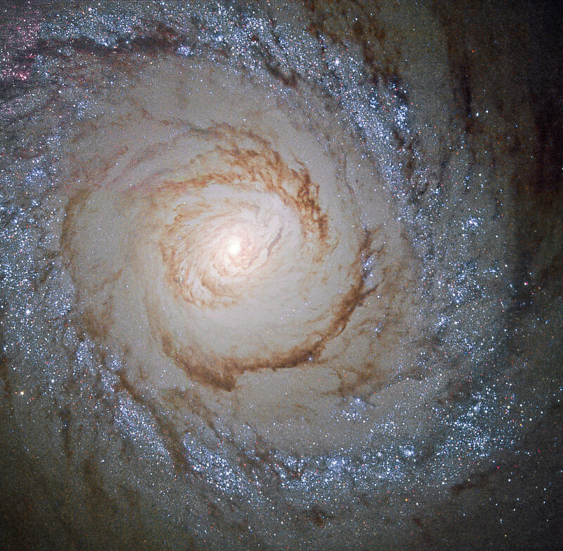 この画像はハッブル宇宙望遠鏡がとらえたもので、渦巻銀河M94(NGC 4736)の中心部が映っています。M94は、りょうけん座の方向、約1600万光年の距離にあります。1781年にフランスの天文学者ピエール・メシャンによって発見された銀河です。