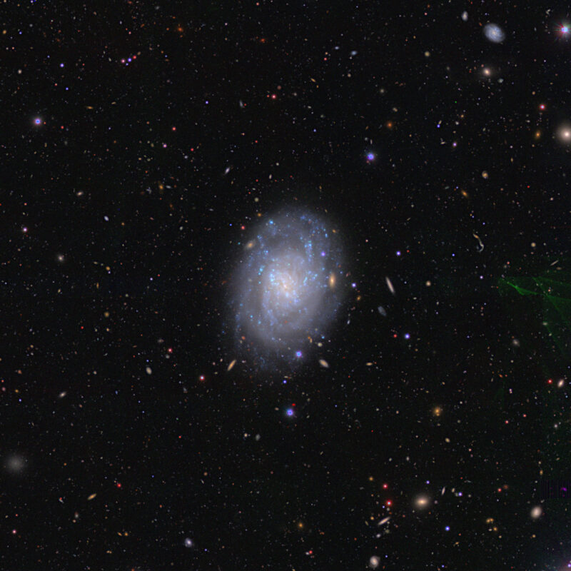 NGC 941は「中間渦巻銀河」に分類されています。中心に棒状の構造をもつ棒渦巻銀河と、棒状の構造をもたない渦巻銀河の中間的な特徴を示す銀河です。全体的に青い色をしていること、またダストレーン(暗黒帯)が見られることは、星形成が活発であることを示しています。NGC 941の周囲には、さらに遠方にある銀河が多数映り込んでいます。