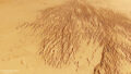 火星のシレナム・フォッサにあるグラーベン(地溝) 2020.10.17 22:20 NASA(アメリカ航空宇宙局)の火星探査機2001マーズ・オデッセイが、火星のシレナム・フォッサの一部をとらえた画像です。 画像に見られる窪みは断層によってできた「グラーベン(地溝)」です。ほぼ平行な断層の間に物質が落下して形成されます。地殻を引き延ばすような力がかかり断層ができました。 シレナム・フォッサのグラーベンは長さ2735kmあります。画像はそのごく一部を撮影したものです。 Image Credit: NASA/JPL-Caltech/ASU (参照)Planetary Photojournal