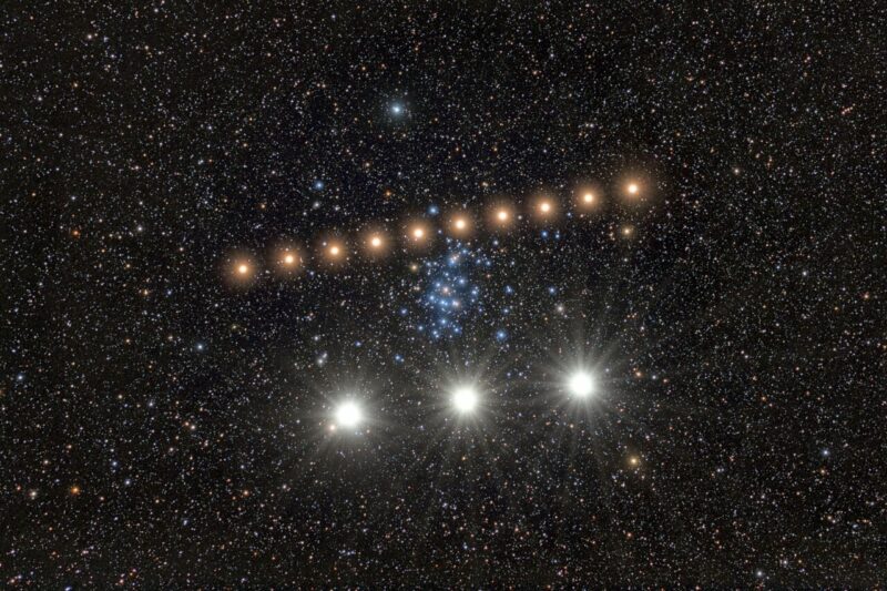 プレセペ星団は、かに座の方向、地球から約600光年離れたところにあります。直径約23光年で1000個ほどの星を含んでいます。そのプレセペ星団に火星が接近したのは2025年4月末から5月初旬、金星が接近したのは8月末から9月初旬のことでした。冒頭の画像は、プレセペ星団と、星団に接近した際の火星と金星を合成したものです。